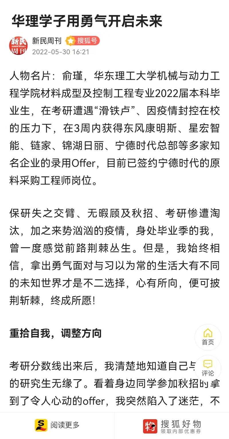 人物名片:俞瑾,华东理工大学机械与动力工程学院材料成型及控制工程专业2022届本科毕业生,在考研遭遇“滑铁卢”、因疫情封控在校的压力下,在3周内获得东风康明斯、星宏智能、链家、锦湖日丽、宁德时代总部等多家知名企业的录用Offer,目前已签约宁德时代的原料采购工程师岗位。