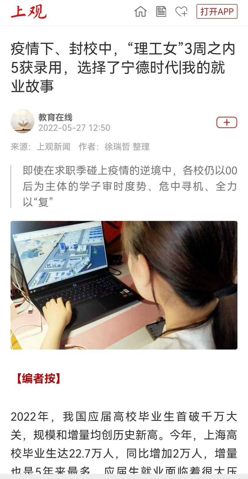 【上观新闻】疫情下、封校中,“理工女”3周之内5获录用,选择了宁德时代|我的就业故事