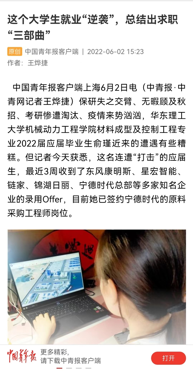 中国青年报客户端上海6月2日电(中青报·中青网记者王烨捷)保研失之交臂、无暇顾及秋招、考研惨遭淘汰、疫情来势汹汹,华东理工大学机械动力工程学院材料成型及控制工程专业2022届应届毕业生俞瑾近来的遭遇有些糟糕。但记者今天获悉,这名连遭“打击”的应届生,最近3周收到了东风康明斯、星宏智能、链家、锦湖日丽、宁德时代总部等多家知名企业的录用Offer,目前她已签约宁德时代的原料采购工程师岗位。