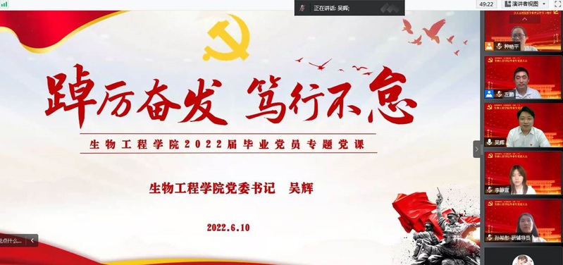 为进一步加强毕业生党员的党性教育,使毕业生党员在学思践悟中踔厉奋发,不忘初心、牢记使命,6月10日,生物工程学院开展以“逐梦新时代,奋进新征程,喜迎二十大”为主题的2022届毕业生党员离校教育活动。生物工程学院党委书记吴辉、学院专职组织员、本科辅导员、研究生辅导员、全体毕业生党员参会。活动由生物工程学院党委副书记左鹏主持。
