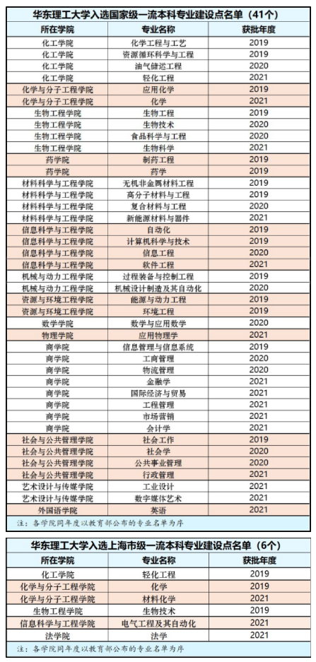 近日,教育部发布了《教育部办公厅关于公布2021年度国家级和省级一流本科专业建设点名单的通知》(教高厅函〔2022〕14号),华东理工大学15个专业获批2021年度国家级一流本科专业建设点,同时新增3个上海市级一流本科专业建设点。截至目前,华东理工大学已有41个国家级一流本科专业建设点、6个省级一流本科专业建设点,所有专业学院均有一流本科专业建设点。除新设专业和中外合作办学专业外,学校工科类、理科类和文商类一流本科专业比例分别达到92%、78%和63%。