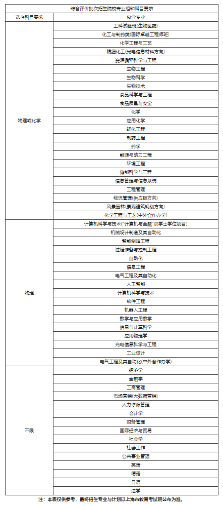 学校2022年在上海市综合评价录取招生专业及选考科目要求等参考信息详见下表,最终招生专业与计划以上海市教育考试院公布为准。
