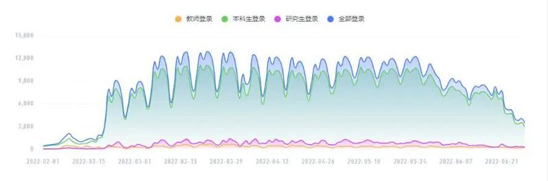 目前,基于网络学习空间的教学实践已在学校全面开展。原计划用2-3年的时间,逐步完成培训与教学应用,但疫情的突然出现加速了应用的进程。受新冠疫情影响最大的学期(2020、2022上半年),全校师生基于空间开展线上教学,每天约15000余名全日制本研师生访问,最高并发人数为16234人,每学期访问量达1800万次,建课2000余门,线上教学活动21万多次,有效保障了全校教学工作的正常开展。本校全部本、研、继、校外辅修学生都参与了网络学习空间的教学,每年2.3万余名全日制本研学生,1万余名继续教育学生,基于此平台开展线上与混合式教学活动。在学校教务处的教学调查中,85%以上的学生认为基于在线学习平台的教学效果良好。