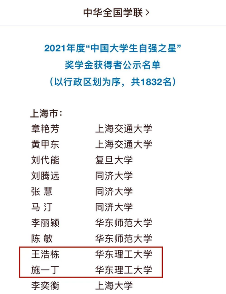 近日,由共青团中央、中华全国学联共同主办的2021年度寻访“中国大学生自强之星”活动评选结果正式揭晓。经崇明团区委和学校联合推荐,华东理工大学信息科学与工程学院2019级本科生王浩栋、施一丁入选,荣获“中国大学生自强之星”称号。