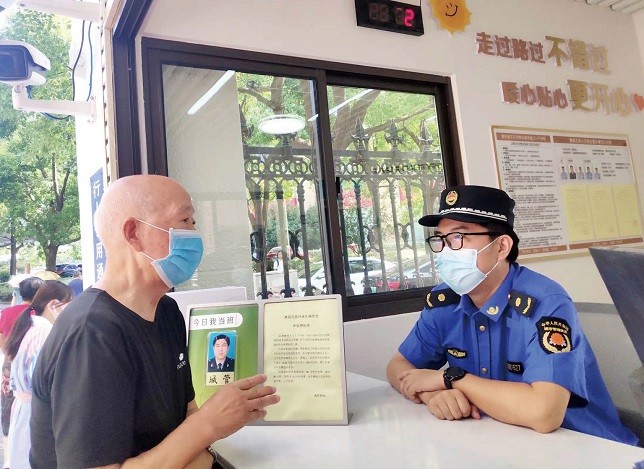 浦东新区塘桥街道城管队员在小区保安室解答居民疑惑。