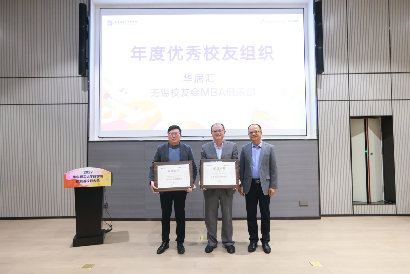 华理商学院房产俱乐部(华居汇)和华理无锡校友会MBA俱乐部荣获本年度“优秀校友组织奖”。华居汇秘书长孙立新校友、华理无锡校友会MBA俱乐部代表朱昌益校友上台领奖。