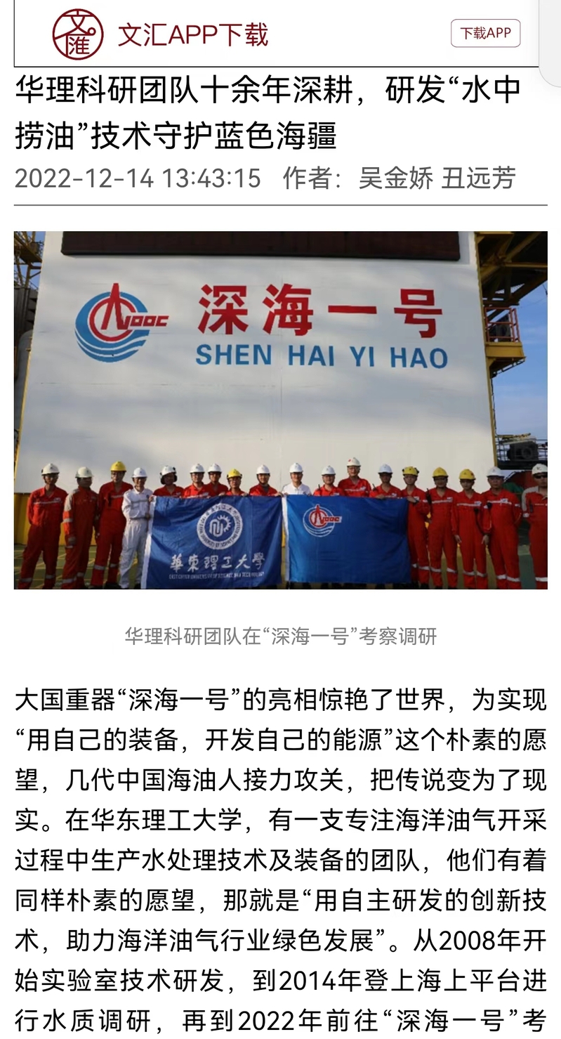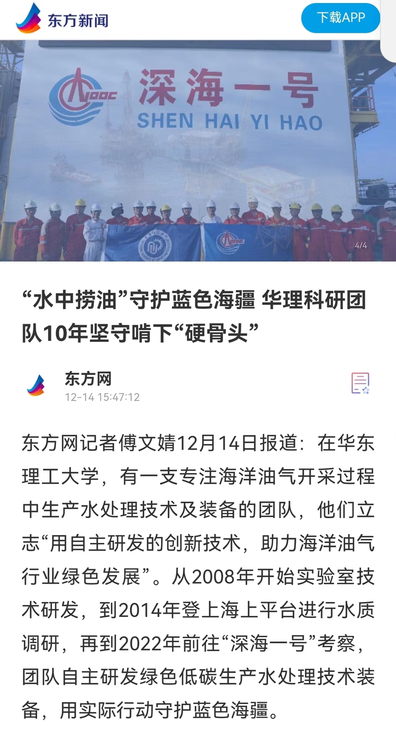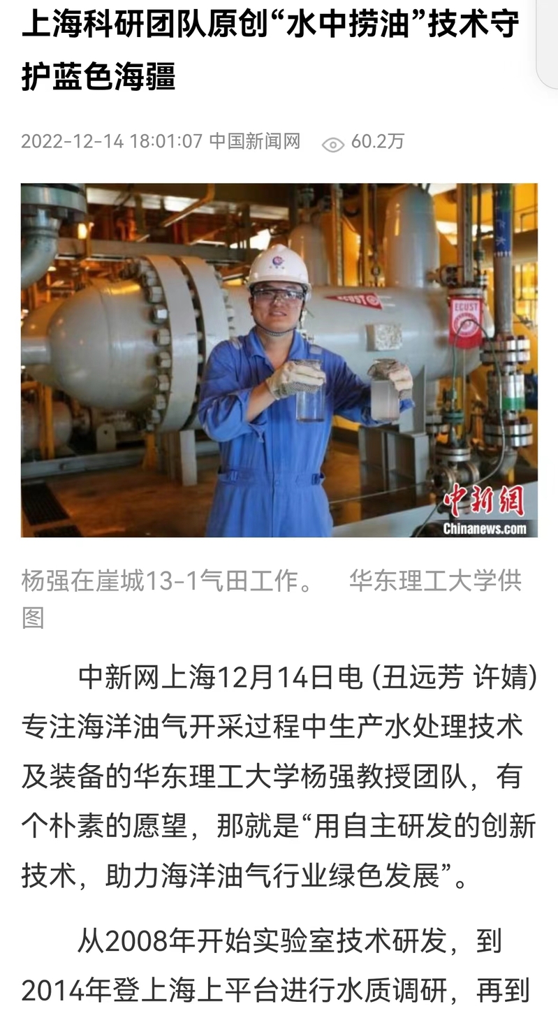 华理杨强教授团队十余年执著坚守,自主研发绿色低碳生产水处理技术装备,用原创“水中捞油”技术守护蓝色海疆。中国青年报客户端、中国新闻网、学习强国、文汇app、上海教育新闻网、第一教育、上海科技报、东方网、新民周刊等近10家媒体进行了原发报道,本篇选取部分报道予以转载。