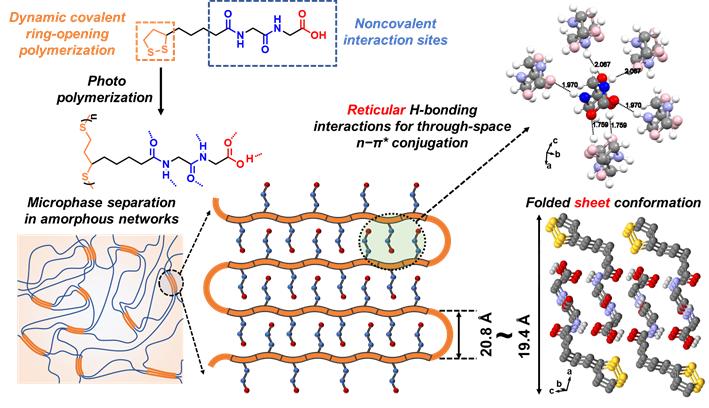 研究团队开发了一种构筑发光性能可调谐的CTE体系的简单且通用的策略,该策略可指导动态小分子基元/砌块自组装成具有β-折叠氢键域的聚合物网络。网状交联氢键导致构象刚性化,从而促进了富电子基团的n–π*跃迁和TSC,有助于实现高效的绿色荧光和低温磷光。与此同时,动态共价键和非共价氢键的协同作用赋予了所得聚合物以机械强度和适应性。