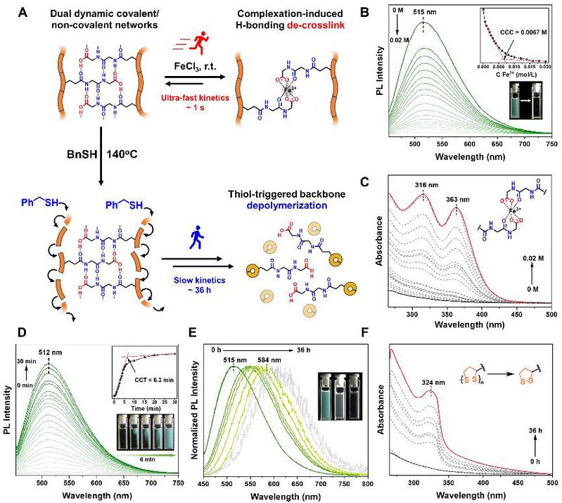 图2.动态网络正交降解示意图:(I)金属络合诱导的氢键解交联;(II)硫醇引发的主链解聚