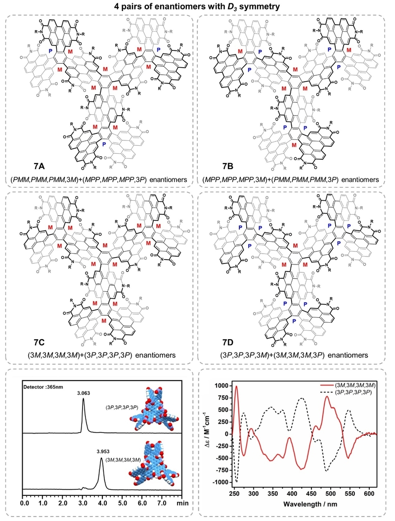 研究人员首先采用由内而外的合成方法构筑了以苝酰亚胺为结构单元的三重[5]螺烯手性核,随后经历六倍Suzuki偶联和光环化反应构筑了外层三个手性中心得到了目标产物。通过巧妙的由内向外的手性诱导实现了对分子内四个独立手性中心的手性精准调控。