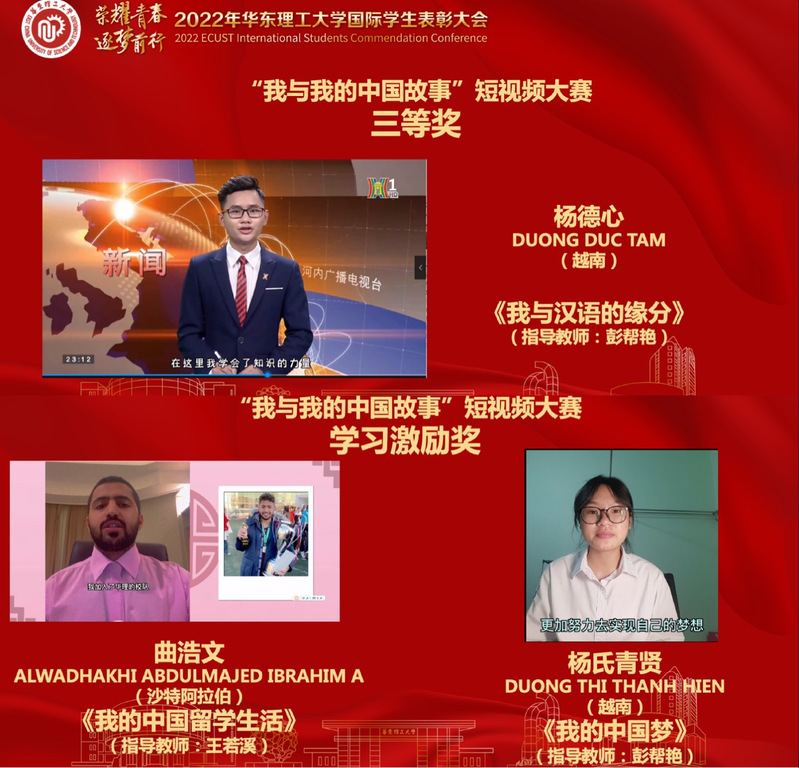 “我与我的中国故事”短视频大赛由汉考国际与清华大学东南亚中心共同主办。越南籍杨德心携作品《我与汉语的缘分》荣获三等奖;越南籍杨氏青贤和沙特阿拉伯籍曲浩文分别凭借《我的中国梦》和《我的中国留学生活》获得学习激励奖。我校作为参赛机构,在此次比赛中荣获优秀组织奖。