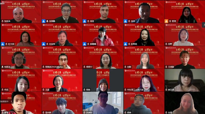 2022年12月31日下午,国际教育学院于线上成功举办2022年华东理工大学国际学生表彰大会,华东理工大学副校长李剑、研究生院院长杜文莉、学工部部长崔姗姗、教务处副处长刘金库出席,国际教育学院全体师生参加会议。本次大会由国际教育学院院长李霄鹏主持。
