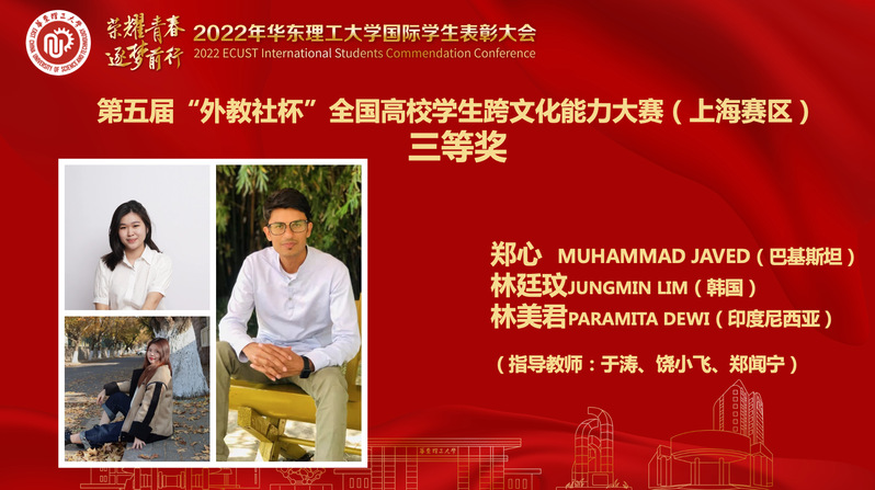 在第五届“外教社杯”全国高校学生跨文化能力大赛上海赛区决赛中,巴基斯坦博士研究生郑心、韩国硕士研究生林廷玟、印度尼西亚本科生林美君三位同学在案例展析和讲述中国故事两个环节中协同配合、团结合作,获得上海赛区三等奖。