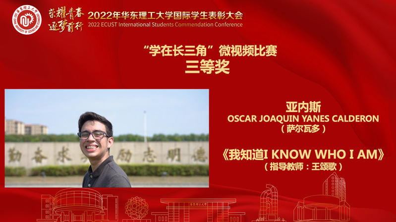 萨尔瓦多籍本科生亚内斯携作品《我知道I KNOW WHO I AM》获得“学在长三角”微视频比赛三等奖,此项赛事由上海市、江苏、浙江和安徽省教育厅(教委)主办。