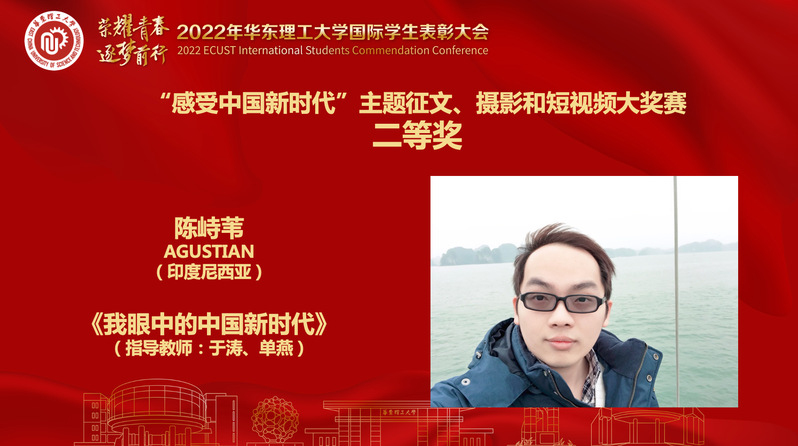 来自印度尼西亚的硕士研究生陈峙苇以《我眼中的中国新时代》一文,获得由中共中央对外联络部《当代世界》杂志社与中国新华新闻电视网、中国路桥工程有限责任公司联合主办,国家留学基金管理委员会秘书处协办的“感受中国新时代”主题征文比赛全国二等奖。