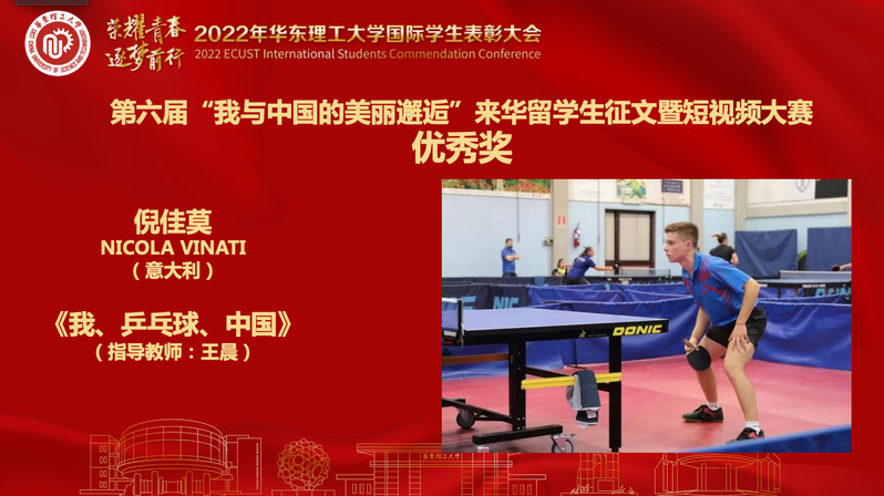 意大利汉语进修生倪佳莫凭借《我、乒乓球、中国》一文在教育部国际合作与交流司、教育部留学服务中心主办的“我与中国的美丽邂逅”系列征文大赛中,荣获优秀奖。