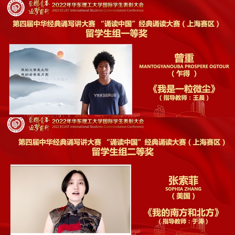 雅言传承文明,经典浸润人生。在由教育部、国家语委主办的2022“诵读中国”经典诵读大赛(上海赛区)中,乍得籍本科生曾重携作品《我是一粒微尘》获得留学生组一等奖。美国籍本科生张索菲凭借《我的南方和北方》获得留学生组二等奖。