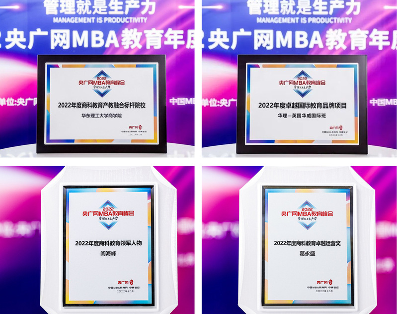 在由中央广播电视总台·央广网主办、中国MBA教育网承办的“管理就是生产力暨2022央广网MBA年度峰会”上,为激励坚守MBA教育初心、持续变革创新、打造行业影响力的商科教育优秀头部力量,大会发布了2022年度MBA教育优秀案例,涵盖商科教育领军人物、商科教育影响力人物、卓越影响力MBA 项目、商科教育品牌实力院校等,为商科教育树立榜样案例。我校商学院荣获央广网“2022商科教育产教融合标杆院校”,华理-英国华威国际项目荣获“2022卓越国际教育品牌项目”,校党委常委、副校长阎海峰教授荣获“2022年度商科教育领军人物”,商学院葛永盛副教授荣获“2022年度商科教育卓越运营奖”。