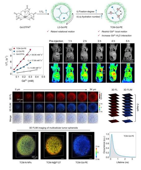 在纳米诊疗体系中,如何基于限域环境精准调控分子运动和相互作用仍面临着极大的挑战。例如,以疏水作用力驱动的组装方式是构筑纳米体系最为广泛的手段(如疏水性分子的自组装、双亲性的嵌段共聚物包裹)。然而,该种策略会使得纳米体系产生“疏水的墙”和“致密的核”,从而导致难以在其内部操纵分子行为。近年来,将光热治疗(PTT)与磁共振成像(MRI)集成在纳米诊疗体系中,对实现个性化诊疗具有重要临床应用价值。值得注意的是,现有纳米体系的限域环境严重抑制了具有光热性能染料的激发态分子内运动,进而极大地限制了其光热性能;此外,“疏水的墙”会阻碍其与水质子间的相互作用,显著地降低产生MRI信号的强度。因此,如何从分子设计策略出发,构建兼具高性能PTT和MRI功能的纳米诊疗体系具有重要的研究意义,亦面临着重大的挑战。