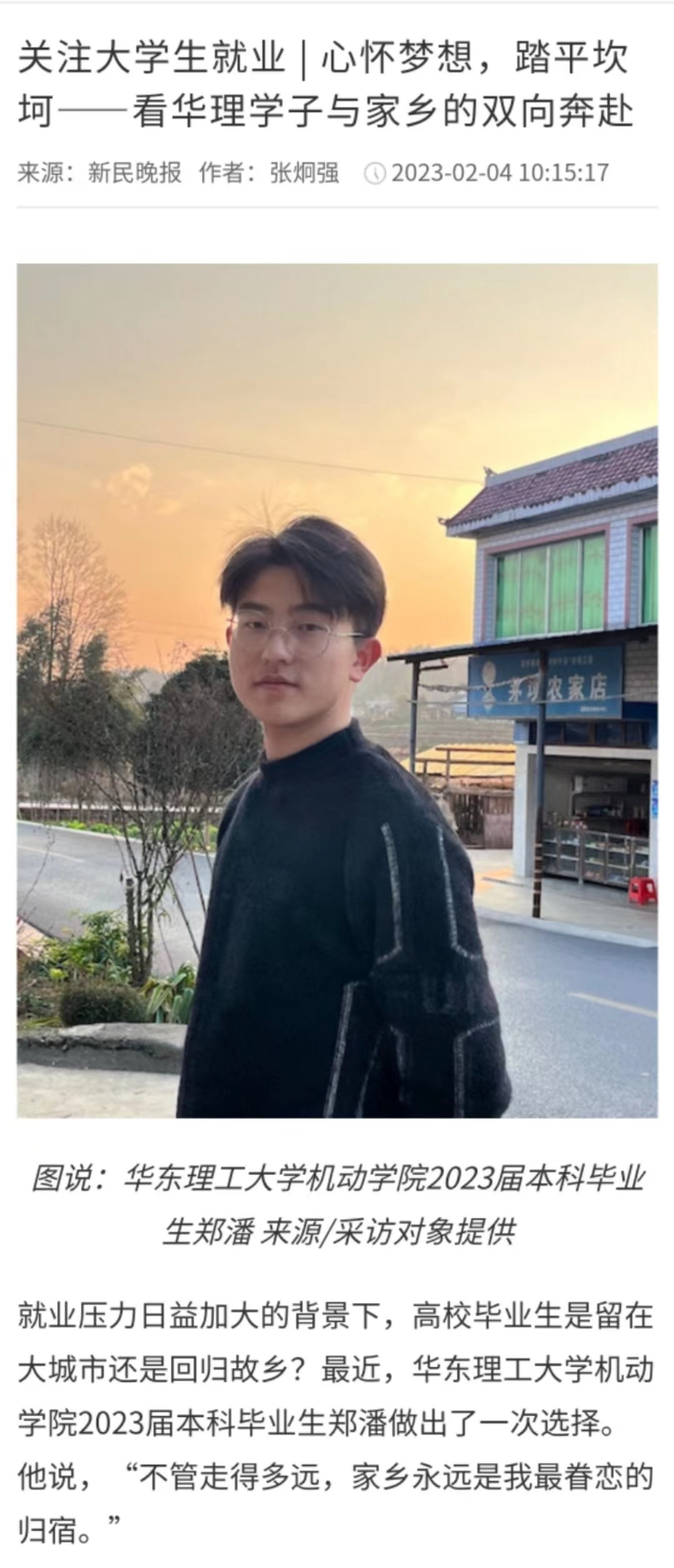 就业压力日益加大的背景下,高校毕业生是留在大城市还是回归故乡?最近,华东理工大学机动学院2023届本科毕业生郑潘做出了一次选择。他说,“不管走得多远,家乡永远是我最眷恋的归宿。”
