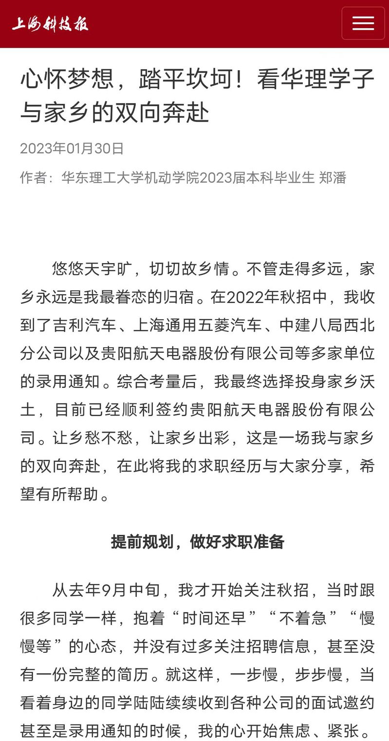 毕业之际,我校机动学院2023届本科毕业生郑潘选择投身家乡沃土,目前已经顺利签约贵阳航天电器股份有限公司。让乡愁不愁,令家乡出彩,这是一场他与家乡的双向奔赴。《青年报》、中国新闻网、新民客户端、东方网、上海科技报、青春上海、第一教育等多家媒体进行了原发报道。本篇选取了部分报道予以转载。