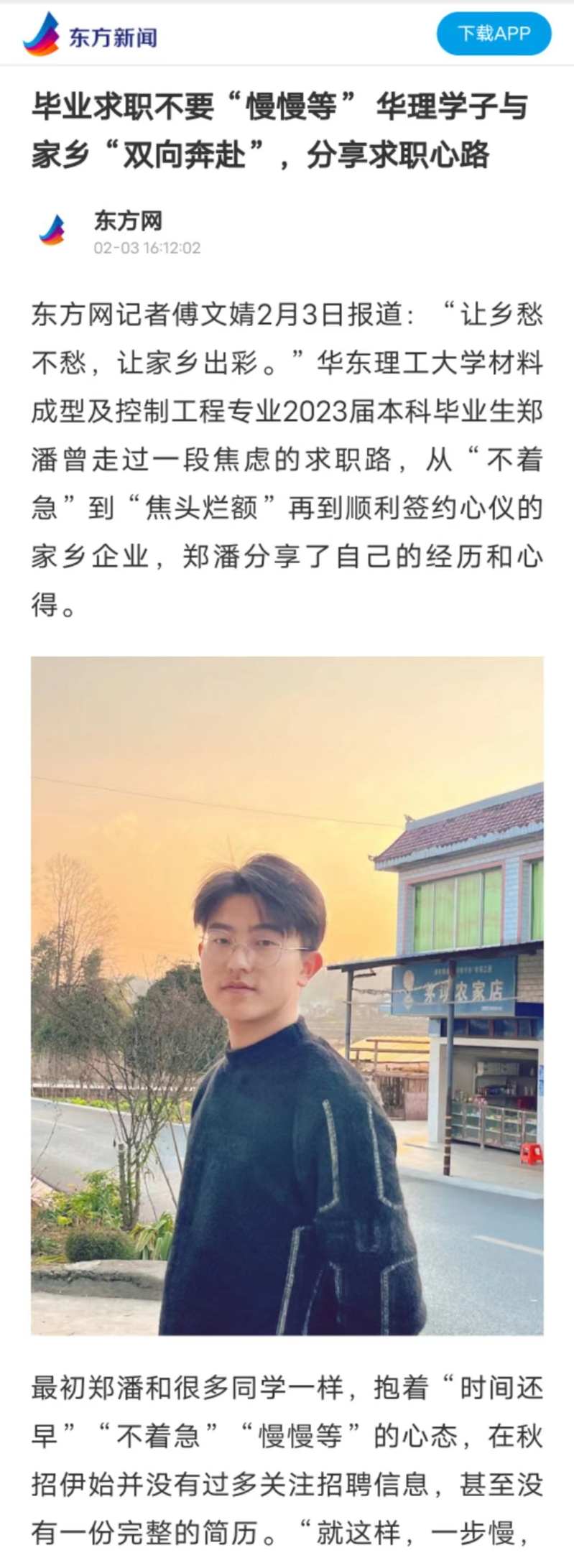 东方网记者傅文婧2月3日报道:“让乡愁不愁,让家乡出彩。”华东理工大学材料成型及控制工程专业2023届本科毕业生郑潘曾走过一段焦虑的求职路,从“不着急”到“焦头烂额”再到顺利签约心仪的家乡企业,郑潘分享了自己的经历和心得。