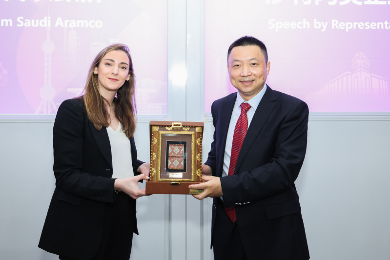 图片说明:沙特阿美代表Rania与李剑副校长互赠礼物