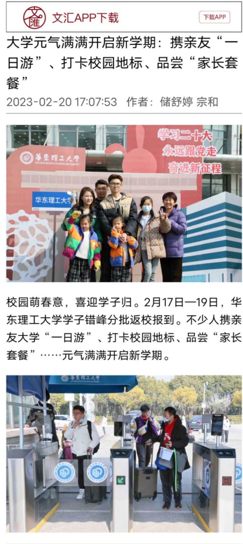 校园萌春意,喜迎学子归。2月17日—19日,华理学子错峰分批返校报到。学校精心安排、用心筹备,扎实细致做好各项服务保障工作,确保学生安全有序返校,平稳推进新学期各项工作。上观新闻、文汇APP、《劳动报》、《青年报》、《新民晚报》、中国新闻网、新民周刊、青春上海、劳动观察、新民客户端、上海教育新闻网、第一教育、上海科技报等10余家媒体对此进行了报道。本篇选取了部分报道予以转载。