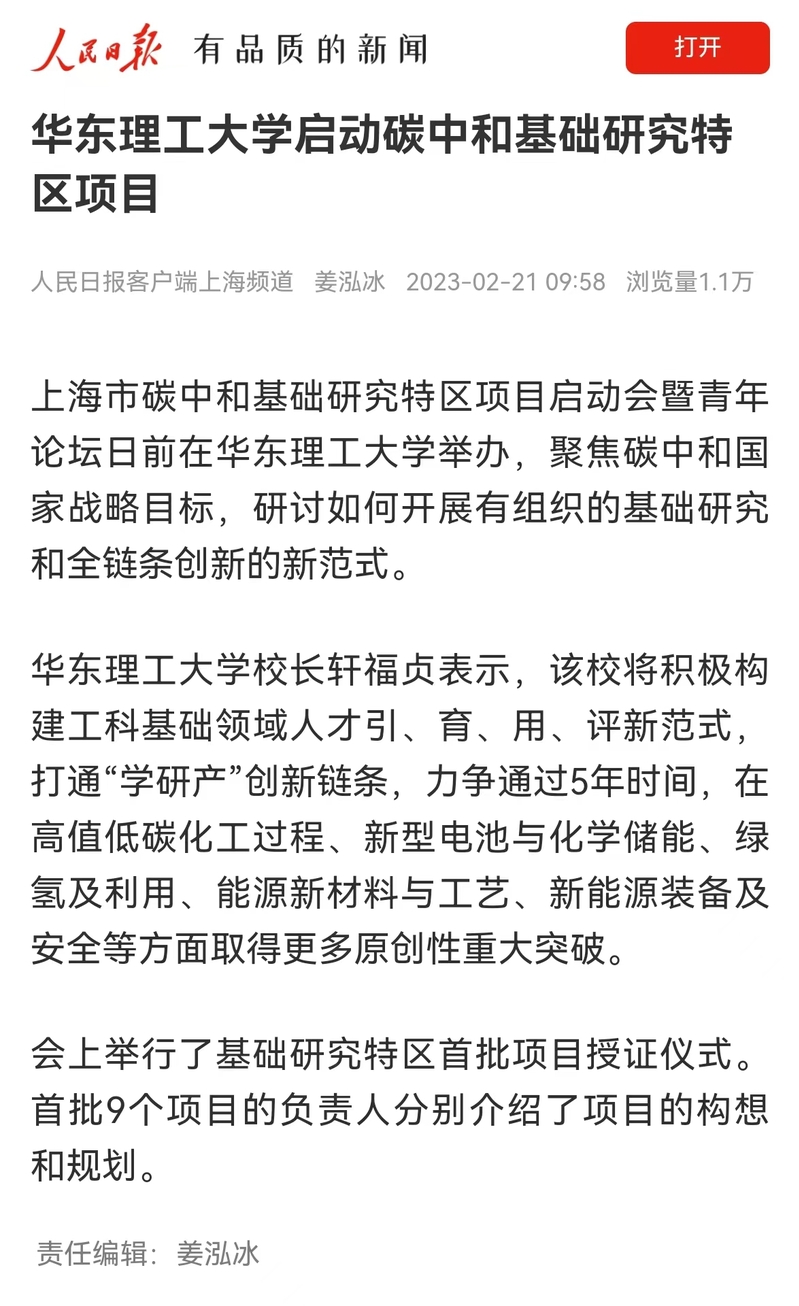 【人民日报客户端】华东理工大学启动碳中和基础研究特区项目
