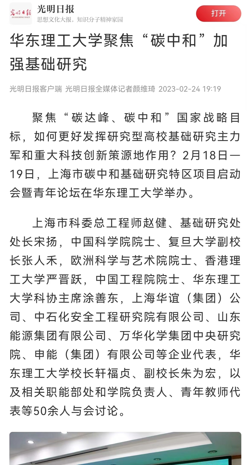 【光明日报客户端】华东理工大学聚焦“碳中和”加强基础研究