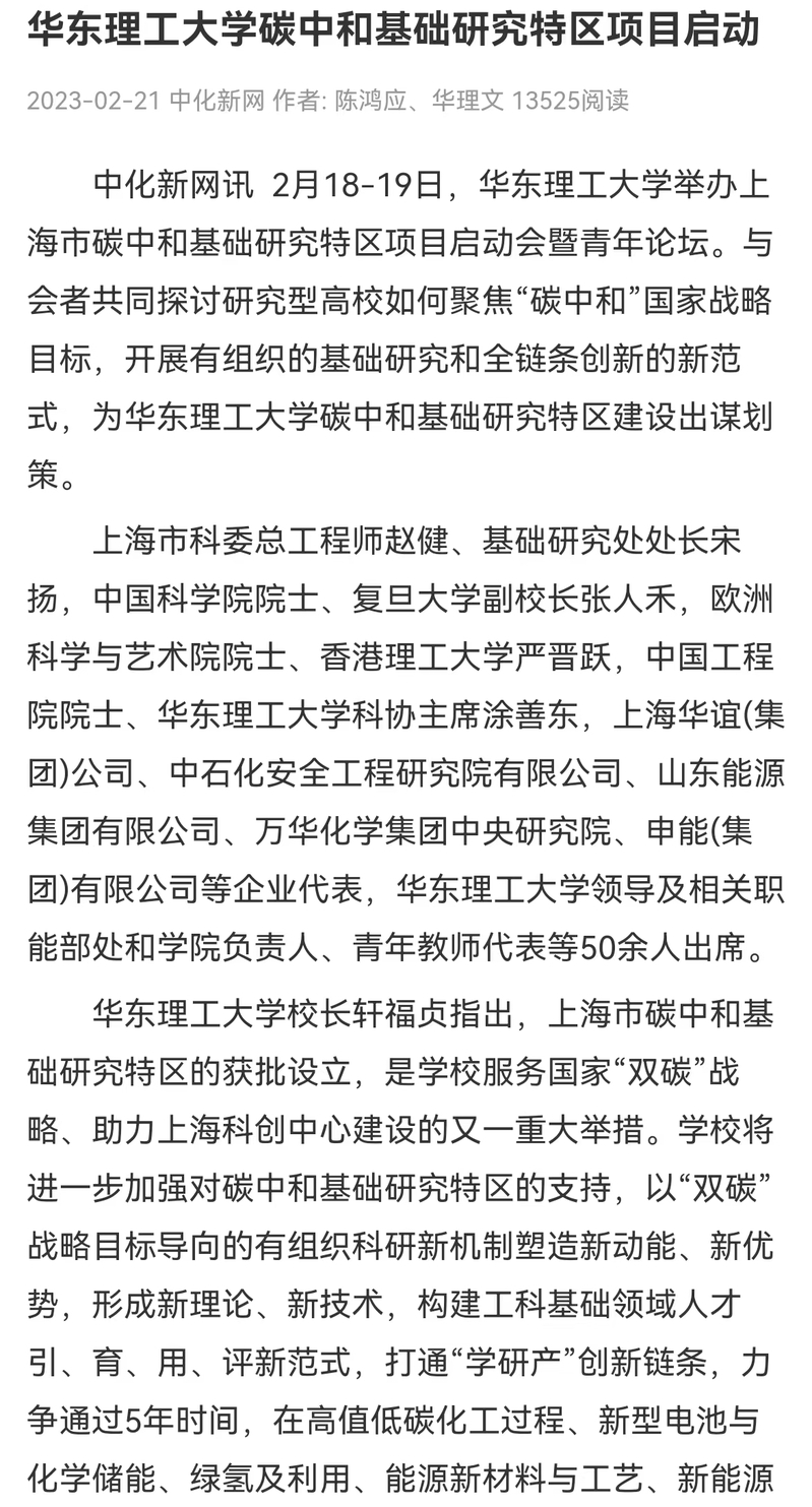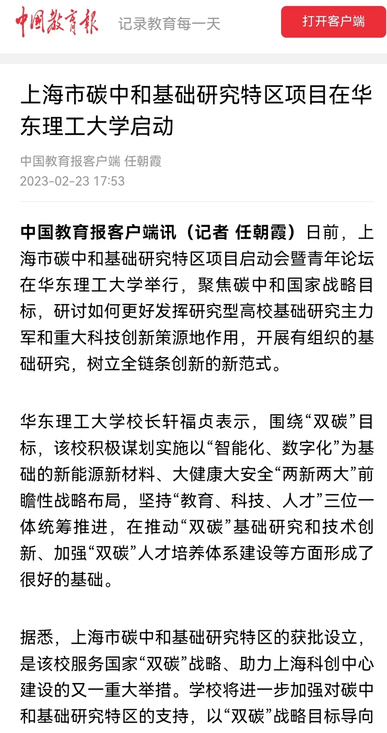 【中国教育报客户端】上海市碳中和基础研究特区项目在华东理工大学启动