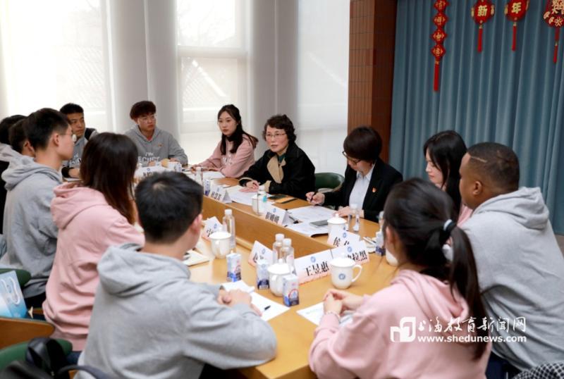 在该校徐汇校区第一食堂二楼研讨室,学生代表就习近平总书记对深入开展学雷锋活动作出的重要指示精神的学习体会以及自己在思想引领、服务学生、志愿服务活动中获得的感悟和收获作交流发言。