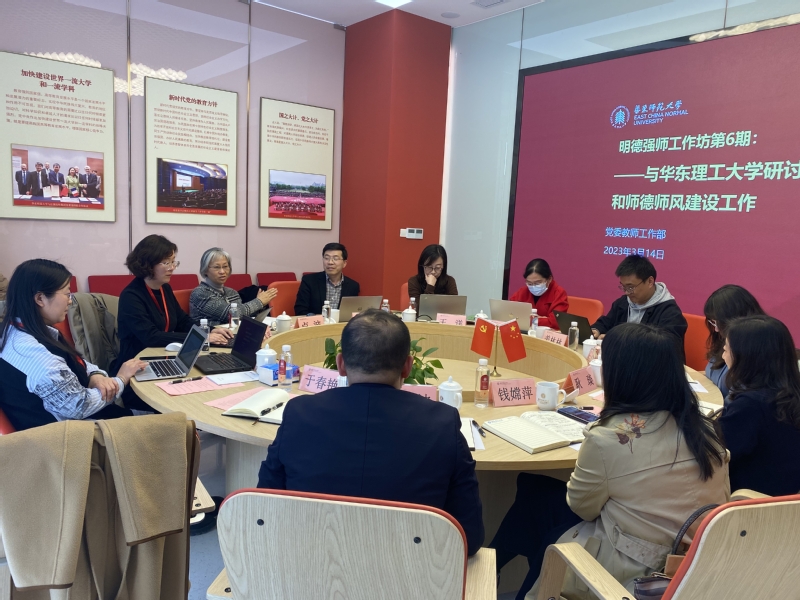 下午,党委教师工作部一行赴华东师范大学学习调研。华东师范大学党委教师工作部常务副部长卢波、党委教师工作部副部长方金奇及全体工作人员,学院相关代表参加了调研交流。会前,双方共同参观了华东师范大学党建服务中心。卢波对华理一行的来访表示欢迎,方金奇介绍了华东师范大学在以制度正师风、以思想铸师魂、以模范促师德、以文化暖师心等方面的工作经验和举措,外语学院专职组织员高冬琴、生命科学学院人事秘书王洋分别介绍了学院特色做法。两校人员分别就相关工作进行了深入交流。