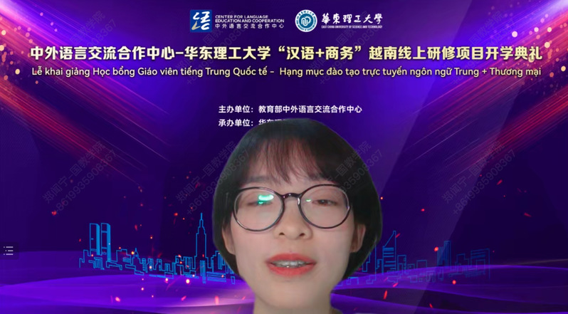 梁氏庆泠(THI KHANH LINH LUONG)代表越南学员在连线视频发言中表示,中国《新上海滩》电影让她与中国结缘,学习中文一直是她的梦想。非常荣幸能够参加此次线上研修项目,该项目一定会为她的人生之船提供强有力的桨板。非常感谢华东理工大学,她期待着参加课程学习,不断超越自我,实现人生理想。