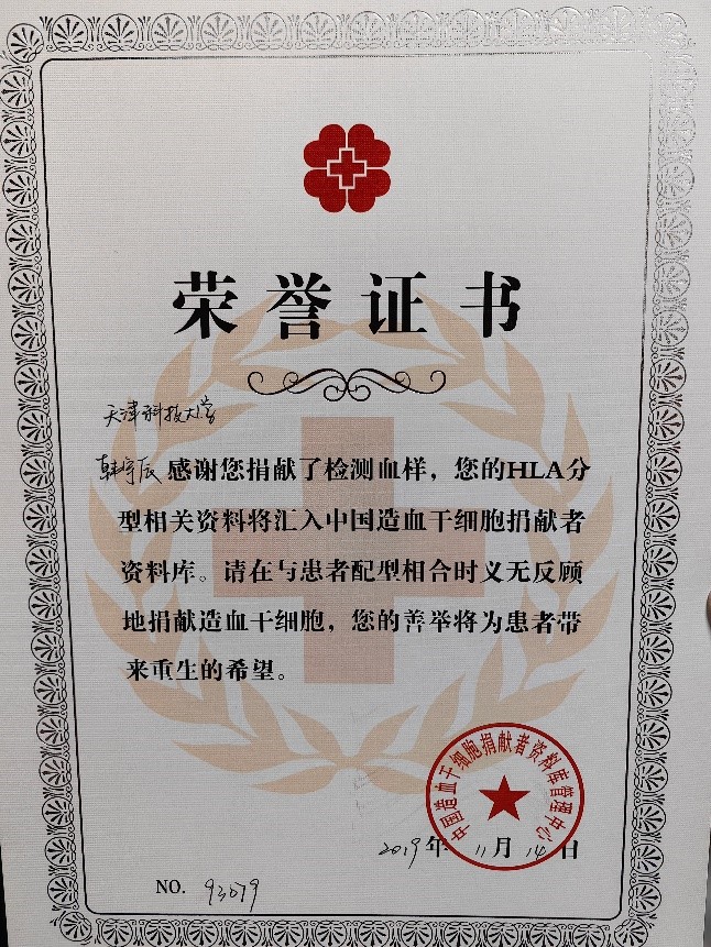 图片说明:韩宇辰成为中华骨髓库志愿者