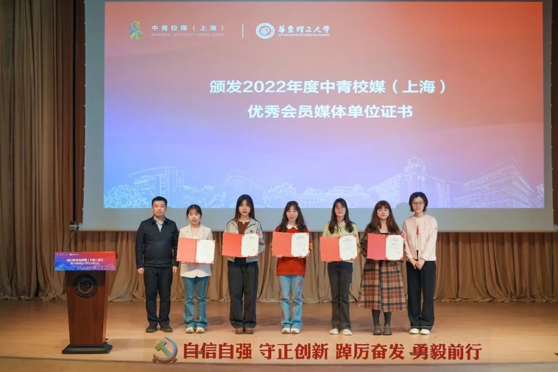 任浡和王烨捷分别为复旦青年(复旦大学)、同济大学、小花梨(华东理工大学)、团在上师大(上海师范大学)、建桥建桥我是新闻(上海建桥学院)颁发了“2022年度中青校媒(上海)优秀会员媒体单位”证书。
