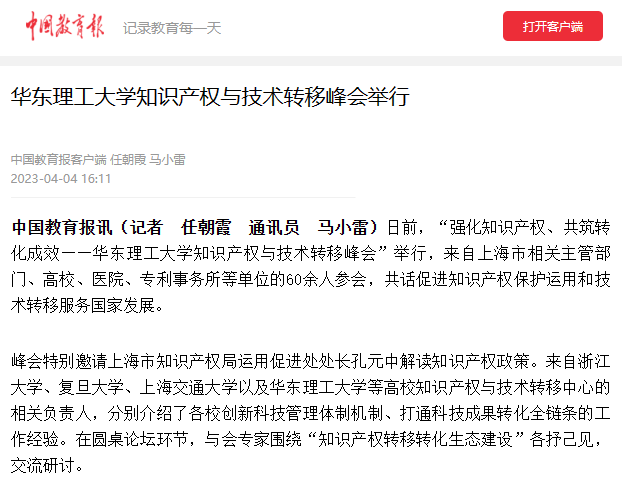 【中国教育报客户端】华东理工大学知识产权与技术转移峰会举行