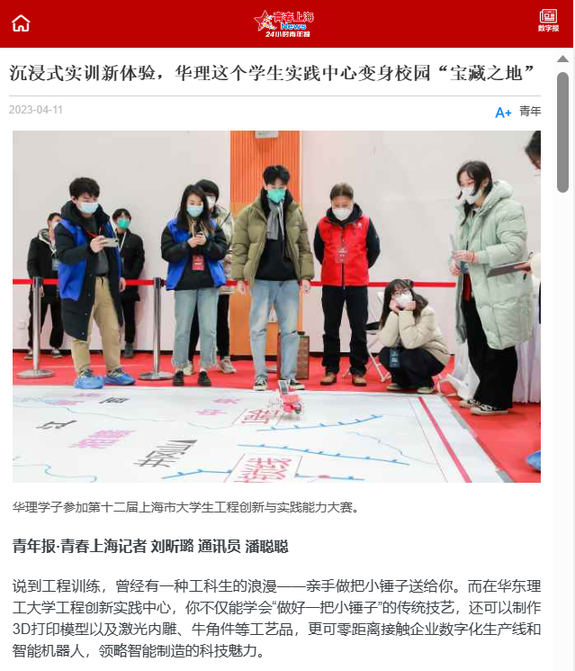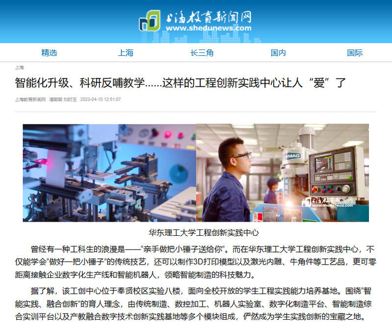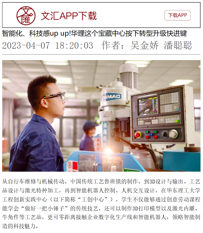 作为面向全校开放的学生工程实践能力培养基地,我校工程创新实践中心围绕“智能实践、融合创新”的育人理念,近年来按下了转型升级的“快进键”,目前由传统制造、数控加工、机器人实验室、数字化制造平台、智能制造综合实训平台以及产教融合数字技术创新实践基地等多个模块组成,正成为学生实践创新的宝藏之地。光明日报客户端、央广网客户端、文汇APP、青春上海、上海教育新闻网、上海科技报、第一教育等媒体对此进行了相关报道。本篇选取了部分报道予以转载。