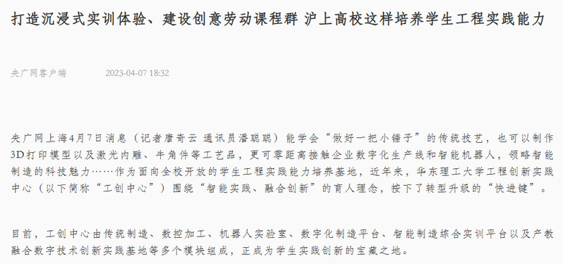 【央广网客户端】打造沉浸式实训体验、建设创意劳动课程群 沪上高校这样培养学生工程实践能力