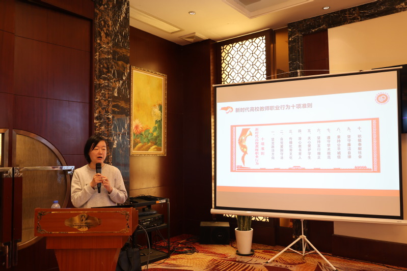 党委副书记李煜佳就纪委工作和师风师德建设工作作了介绍,带领大家共同学习了《新时代高校教师职业行为十项准则》,希望大家做政治觉悟高、职业道德好、专业能力强的新时代高校教师。