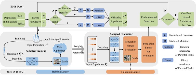 图片说明:进化多任务-神经架构搜索方法EMT-NAS流程图