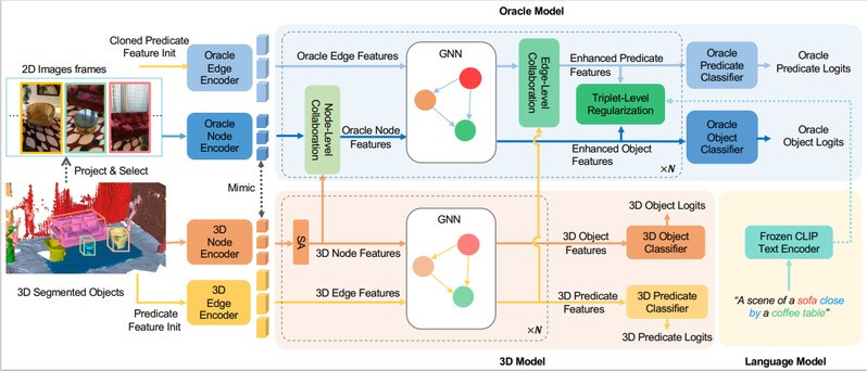 针对如何利用可视化语言语义来辅助三维结构理解的难题,研究人员在论文“VL-SAT:点云中三维语义场景图预测的视觉语言语义辅助训练”中,创新地提出了视觉语言语义辅助训练方案VL-SAT。该方案可以显著增强3DSSG预测模型对长尾和模糊语义关系的区分。其主要思路是通过训练一个强大的多模态oracle模型来协助3D模型的构建。这个多模态模型基于视觉、语言和三维几何信息学习可靠的结构表示和特征,可以在训练阶段不均匀地传递给3D模型。