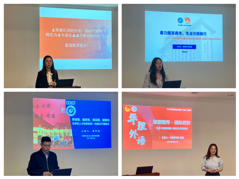 4月19日上午,2022年度华东理工大学“五四红旗团委(标兵)”评审会在和平楼第一会议室举行,入围终评的14个学院团委负责人进行了答辩展示。经过评审,化工学院、商学院、机动学院、外语学院4个学院荣获“五四红旗团委标兵”称号,资环学院、材料学院、社会学院、信息学院、生工学院、艺术学院6个学院荣获“五四红旗团委”称号。来自党办、校办、组织部、宣传部、人事处、教务处、教师工作部、学工部、研究生院、校友与发展联络处、团委等部门的负责同志共同担任评委。