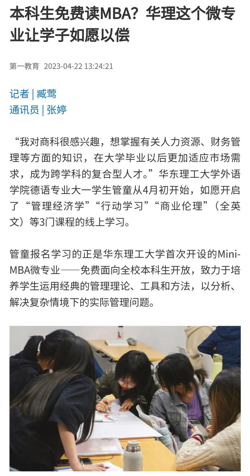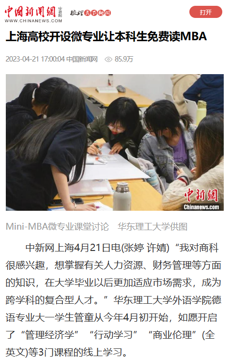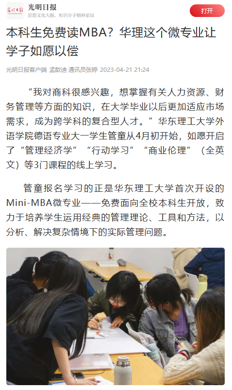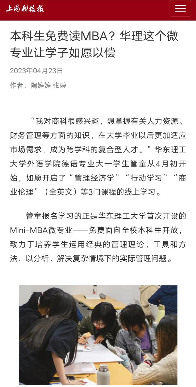 近日,我校商学院整合MBA优势课程,助力复合型人才培养,面向全校本科生免费开设了Mini-MBA微专业,受到光明日报客户端、中国新闻网、新民晚报APP、《上海科技报》、第一教育等媒体的相关报道。