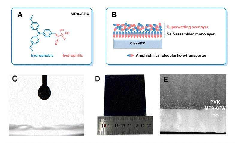 图1. “双亲性”小分子空穴传输材料动态组装“双层”膜结构,实现表面超浸润、大面积制备与器件界面缺陷控制