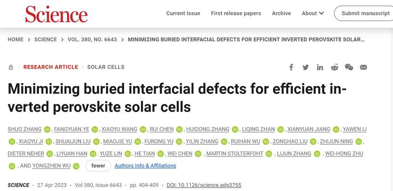该工作创新引入氰基膦酸单元,发展双亲性小分子空穴传输材料,通过动态自组装构筑有序、超薄、表面超浸润层,“一石二鸟”完美解决了器件应用中载流子输运和界面缺陷控制两大难题。这也是华东理工大学首次以第一通讯单位在《科学》发表研究性论文。