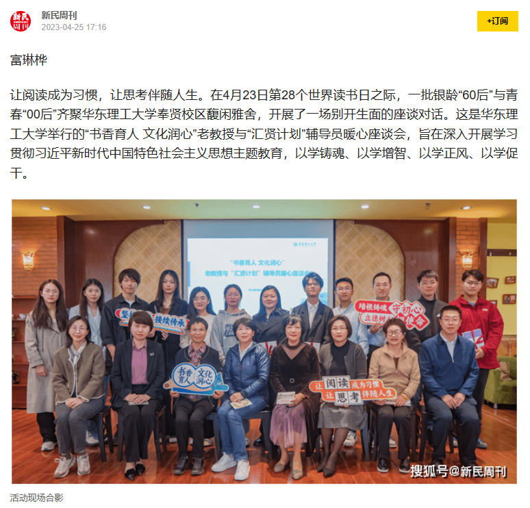 让阅读成为习惯,让思考伴随人生。在4月23日第28个世界读书日之际,一批银龄“60后”与青春“00后”齐聚华东理工大学奉贤校区馥闲雅舍,开展了一场别开生面的座谈对话。这是华东理工大学举行的“书香育人 文化润心”老教授与“汇贤计划”辅导员暖心座谈会,旨在深入开展学习贯彻习近平新时代中国特色社会主义思想主题教育,以学铸魂、以学增智、以学正风、以学促干。