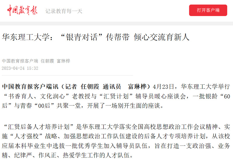 中国教育报客户端讯(记者 任朝霞 通讯员 富琳桦)4月23日,华东理工大学举行“书香育人、文化润心”老教授与“汇贤计划”辅导员暖心座谈会,一批银龄“60后”与青春“00后”共聚一堂,开展了一场别开生面的座谈。