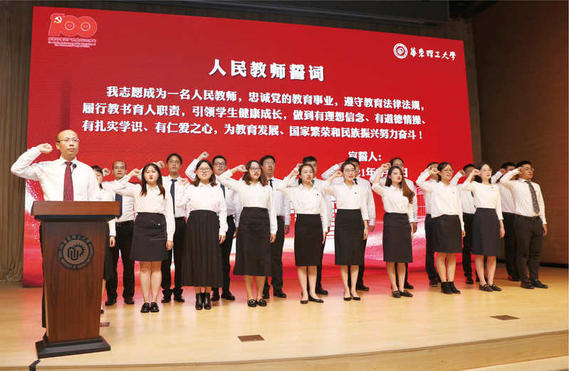 校长、党委副书记轩福贞在教师节庆祝大会上带领新教职工进行入职宣誓