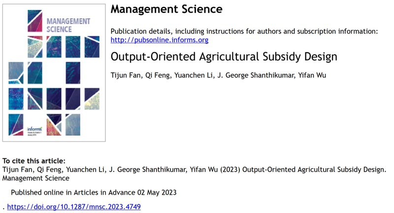 近日,管理科学顶级期刊《管理科学》报道了华东理工大学商学院范体军教授、吴一帆副教授与合作者在政府农业补贴政策设计优化方面的研究成果。